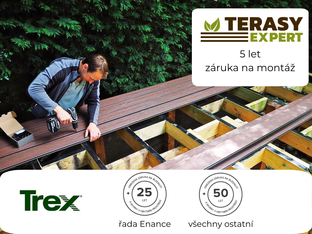 Naše společnost TERASY EXPERT s.r.o. poskytuje komplexní záruky na montáž teras a stálobarevnost terasových prken TREX. Při montáži garantujeme profesionální přístup a precizní provedení s pětiletou zárukou na montážní práce. Naše terasy TREX jsou navrženy tak, aby odolaly i těm nejnáročnějším podmínkám, a proto nabízíme záruku na stálobarevnost až 25 nebo dokonce 50 let, v závislosti na konkrétním produktu. Tato dlouhodobá záruka je důkazem naší důvěry v kvalitu materiálů a našeho závazku k vaší spokojenosti.